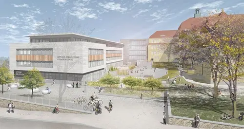 Die Planungen für den neuen Anbau und den Umbau der altehrwürdigen Lessingschule sind längst im vollen Gange. Dabei gibt es nun einen Entwurf des verantwortlichen Architektenbüros. Daraus sind nachfolgend zwei Ansichten ausgewählt, damit man eine Vorstellung von dem neuen Gesicht der Schule nach Vollendung der Baumaßnahmen bekommt.