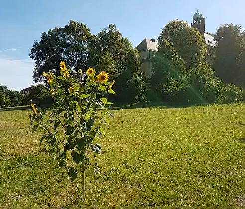 Vor den bald beginnenden Bauarbeiten ist hier noch ein Bild von der "alten" Schule zu finden. Die einsame Sonnenblume steht auf der Wiese, wo früher die Kleingartenanlage stand, die nun für die Erweiterung der Schule weichen musste.